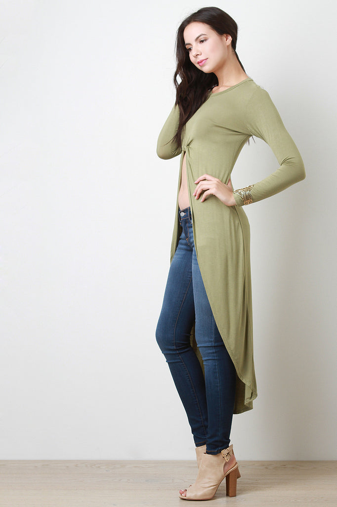 Description This jersey knit top features a round neckline, long sleeves, strategically place center seam, crop construction to a high-low hemline and a knotted front design. Accessories sold separately. Made in U.S.A. 95% Rayon, 5% Spandex.