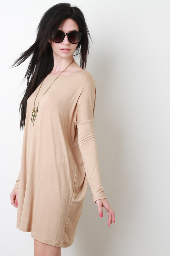Description Keep your look casual with the Sweet Serenade Dress. This dress features soft stretch knit, boat neckline, long dolman sleeves, shift dress design, and finished with stitching detail. Accessories sold separately. Made in U.S.A. 95% Polyester, 5% Spandex.
