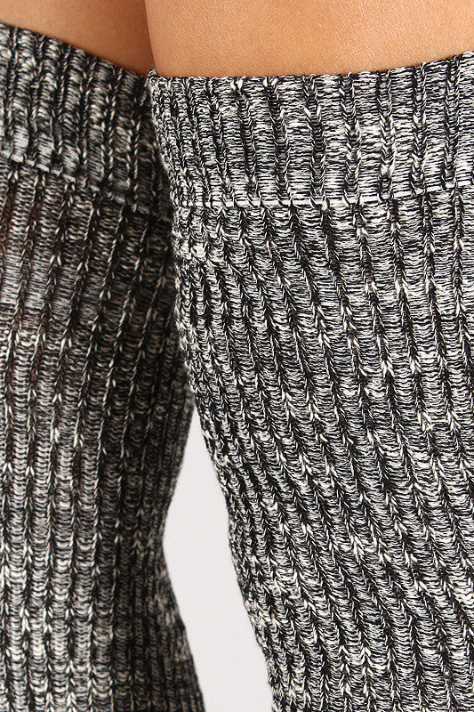 Thick marl knit thigh high socks with an elastic top.