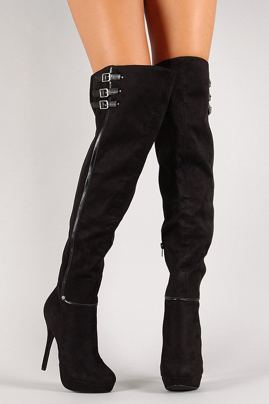 Featuring faux suede upper, three leatherette buckled straps embellishments at collar, slit and elastic gusset at back, leatherette trim at side, almond toe, platform, stiletto heel, stitching detail, fabric interior lining, lightly padded insole, and side zipper closure for easy on/off.