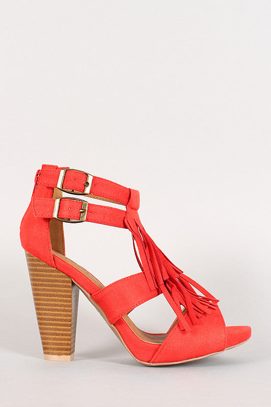 Description Featuring faux suede upper, open toe, cut out front with fringe detail, double adjustable buckle closure, chunky stacked heel, and lightly padded insole.