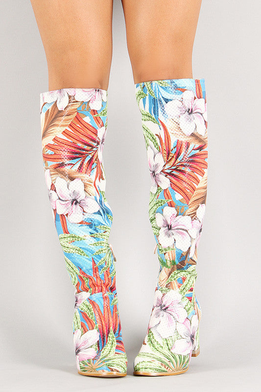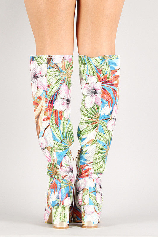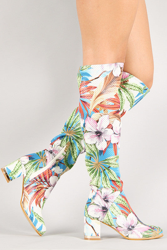 This beautiful floral perforated design upper, round toe, side zipper, and chunky metallic trim heel.
