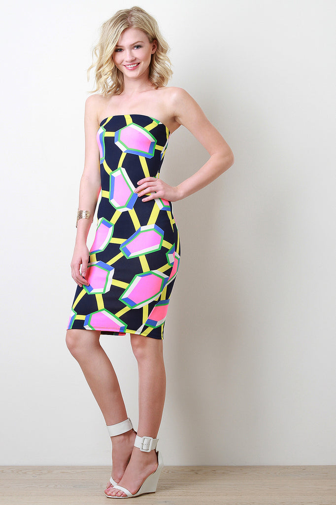 Description This bold midi dress features a neon-colored hexagon print, elasticized bust line, and sculpted bodycon fit. Accessories sold separately. Made in U.S.A. 92% Polyester, 8% Spandex.