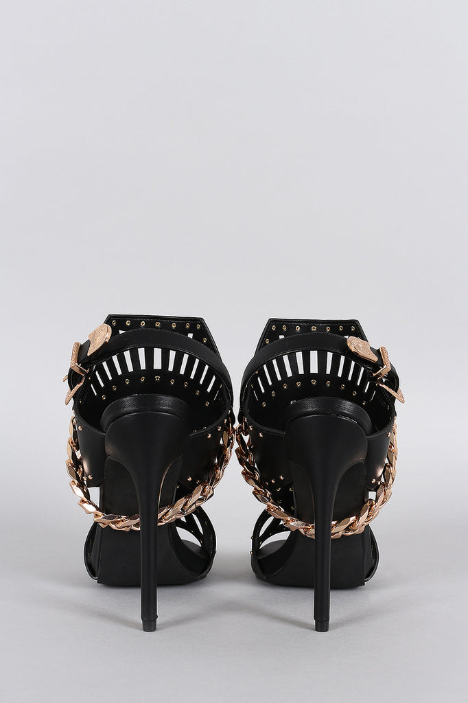Description This striking heel features an open toe, laser cutout design with jewels accent, and wrapped stiletto heel. Finished with large gold tone chain detail, lightly padded insole, and adjustable slingback strap with buckle closure.