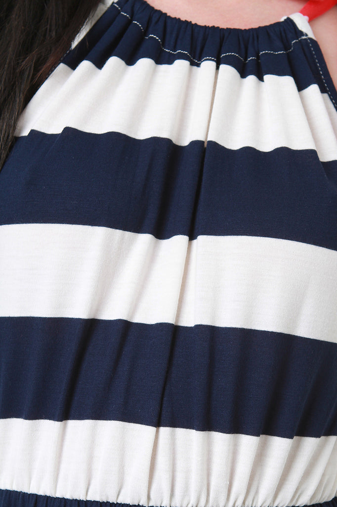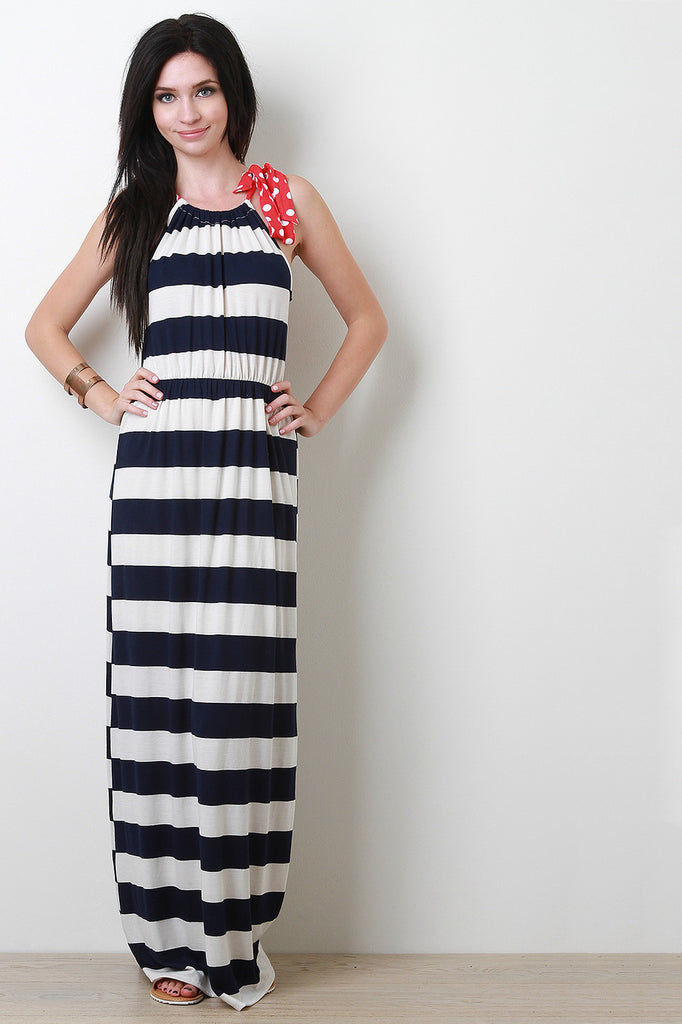 This maxi dress features soft knit, horizontal stripes throughout, halter neckline with self-tie polka dot straps, and elasticized waist. Accessories sold separately. Self: 47% Polyester, 47% Rayon, 6% Spandex. Contrast: 95% Rayon, 5% Spandex. Lining: 100% Polyester.