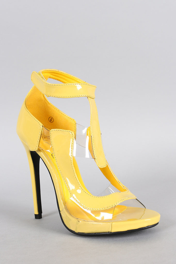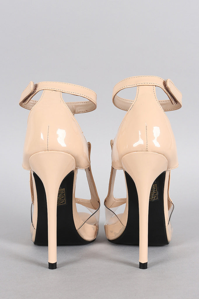 Description This stylish lucite cut out design upper, low platform, stiletto heel, and lightly padded insole for comfort. Finished with hook and loop fastener.