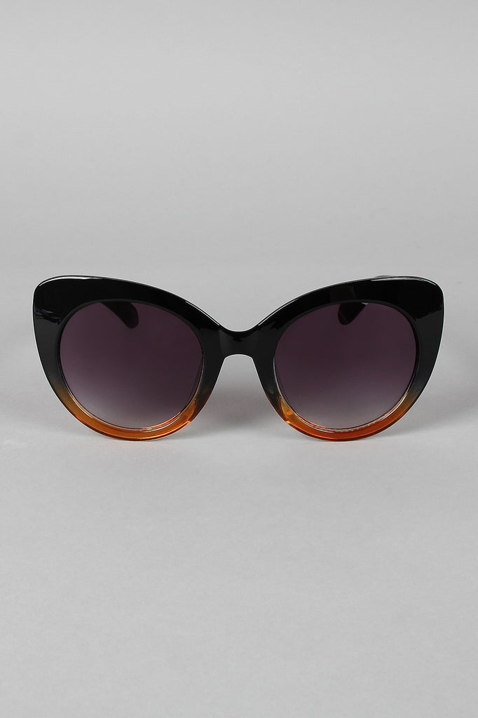 Cat eye shape sunglasses with partially transparent two-tone plastic frame and gradient lenses.