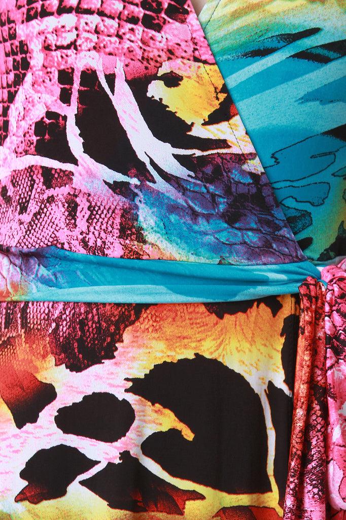 This animal prints throughout. Designed with  a surplice v-neckline, self-tie sash at waist, and a overlapping slit. Accessories sold separately. 95% Polyester. 5% Spandex.