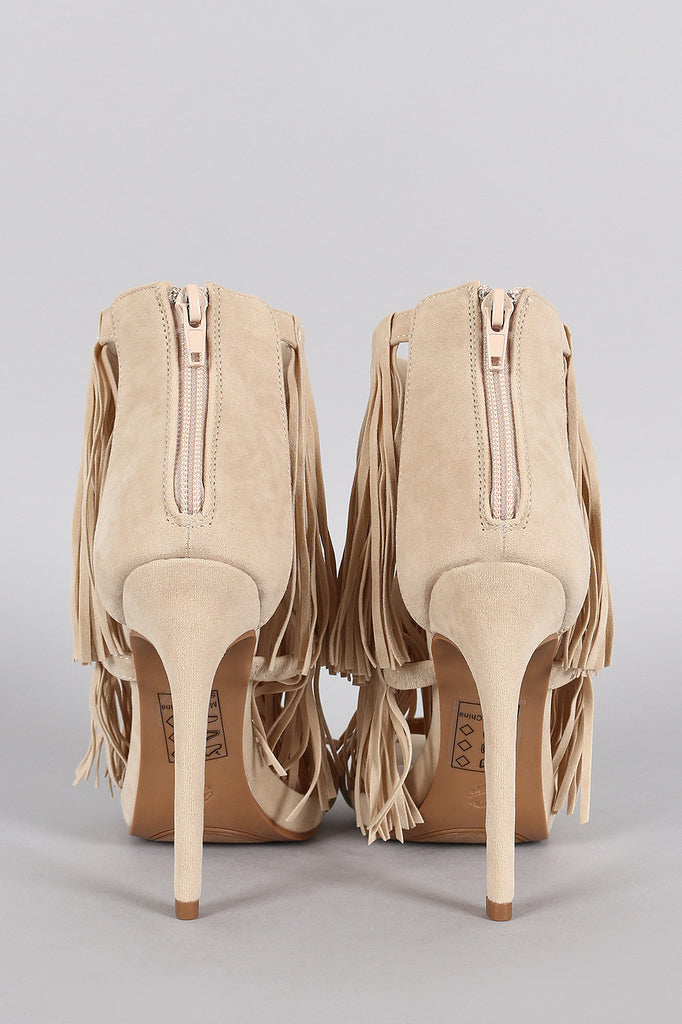 Description This alluring fringe accent, and wrapped stiletto heel. Finished with lightly padded insole and rear zipper closure for easy on/off.