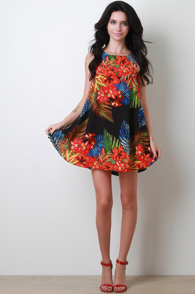 Description This beautiful shift dress features a round neckline, sleeveless construction, keyhole back to a single button closure at nape, and colorful tropical hibiscus print design. Accessories sold separately. Made in U.S.A. 100% Polyester.