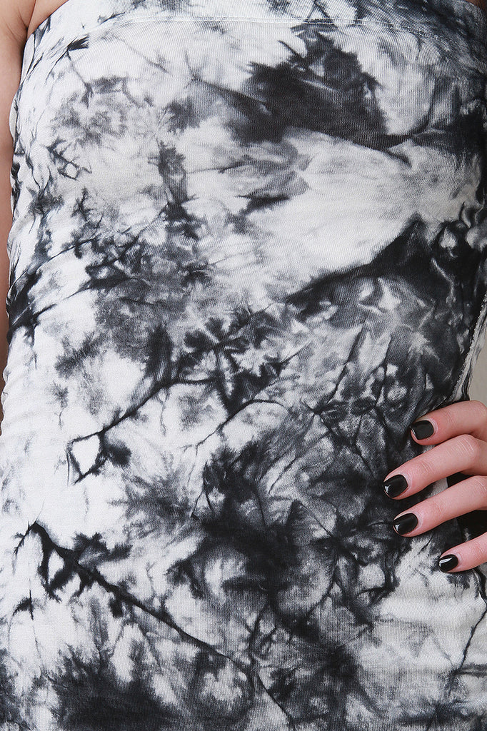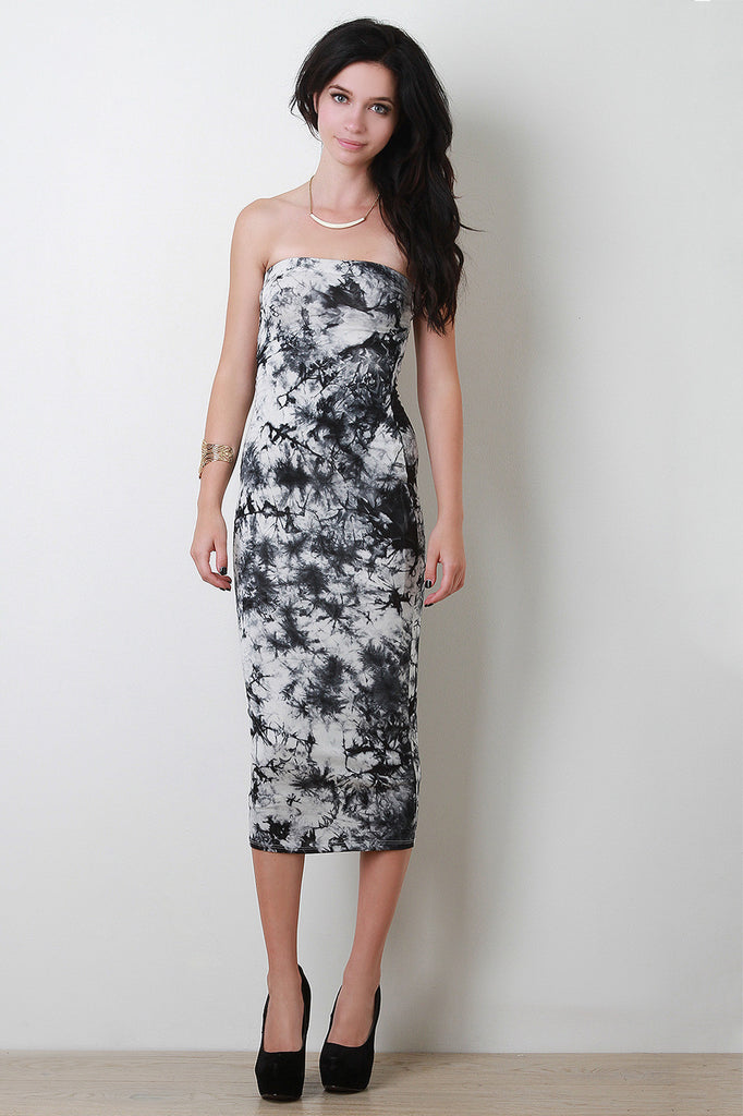 This jersey knit dress features a wide elasticized tube neckline, stretchy sculpture fit, midi length hemline, marbled tie dye print, and full lined. Accessories sold separately. Made in U.S.A. 95% Rayon, 5% Spandex.