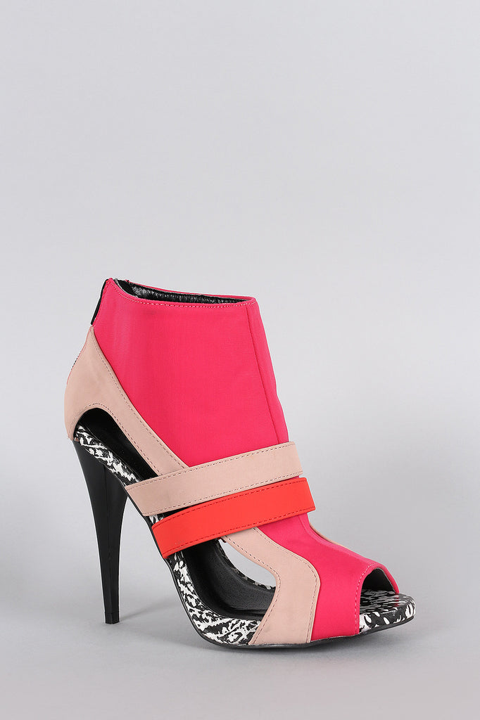 Description This stylish booties feature a peep toe silhouette, colorbock design upper, side cutout detail, and stitching accent. Finished with low platform, lightly padded insole, stiletto heel, and rear zipper closure for easy on/off.