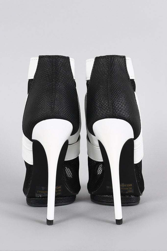 This booties features a semi-sheer mesh with snake embossed vegan leather panels, peep toe silhouette, low architectural platform, and stiletto heel. Finished with cushioned insole and front zip-up closure for easy on/off.