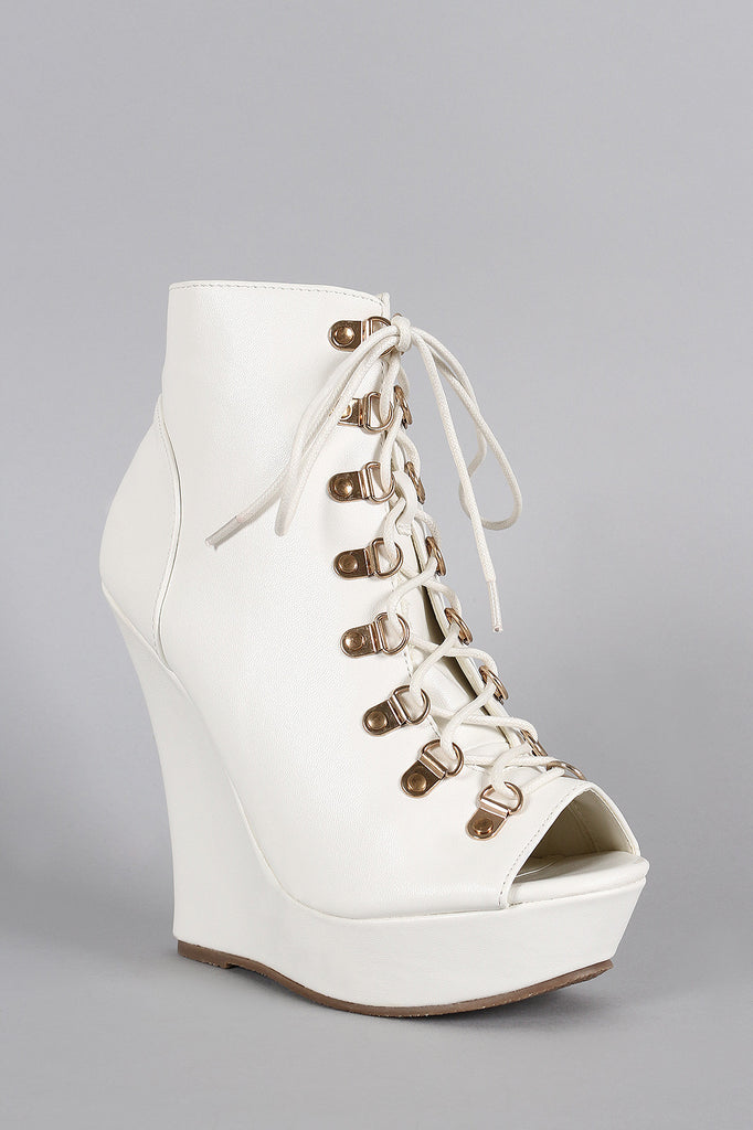 Description This lovely wedge booties feature a peep toe silhouette, lace up front with metallic D rings, and wrapped platform wedge heel. Finished with cushioned insole, soft interior lining, and side zipper closure for easy on/off.