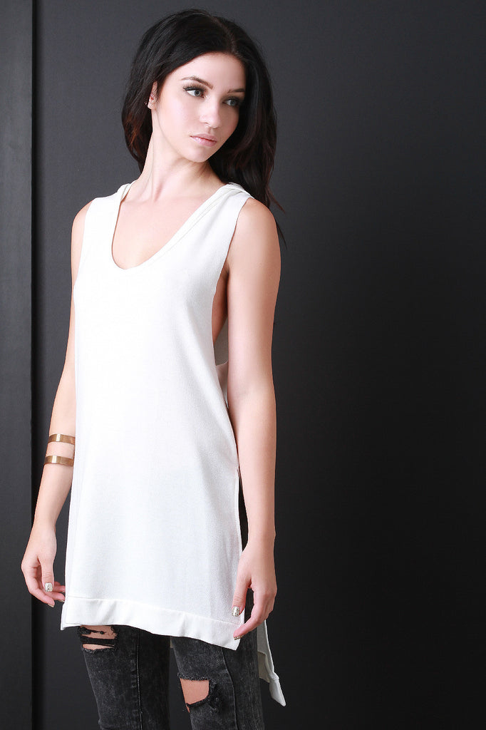 Description This sleeveless top features soft knit, hooded scoop neckline, side slits, and high-low hem. Accessories sold separately. Made in U.S.A. 48% Rayon, 48% Polyester, 4% Spandex.