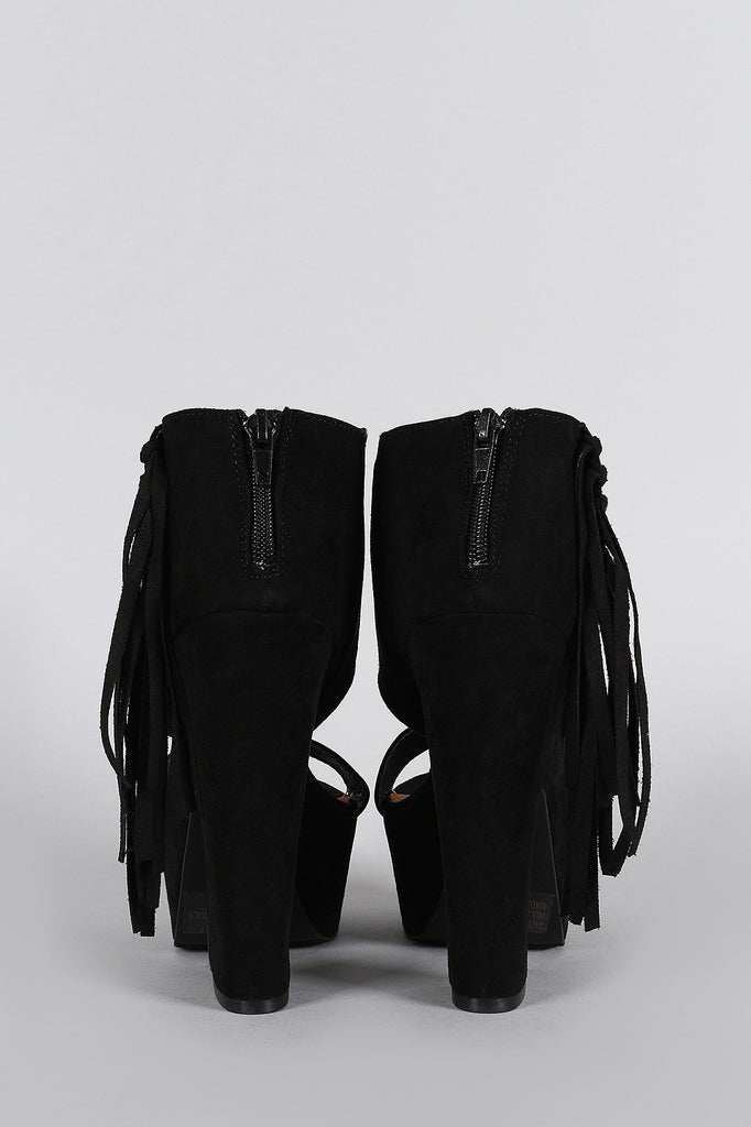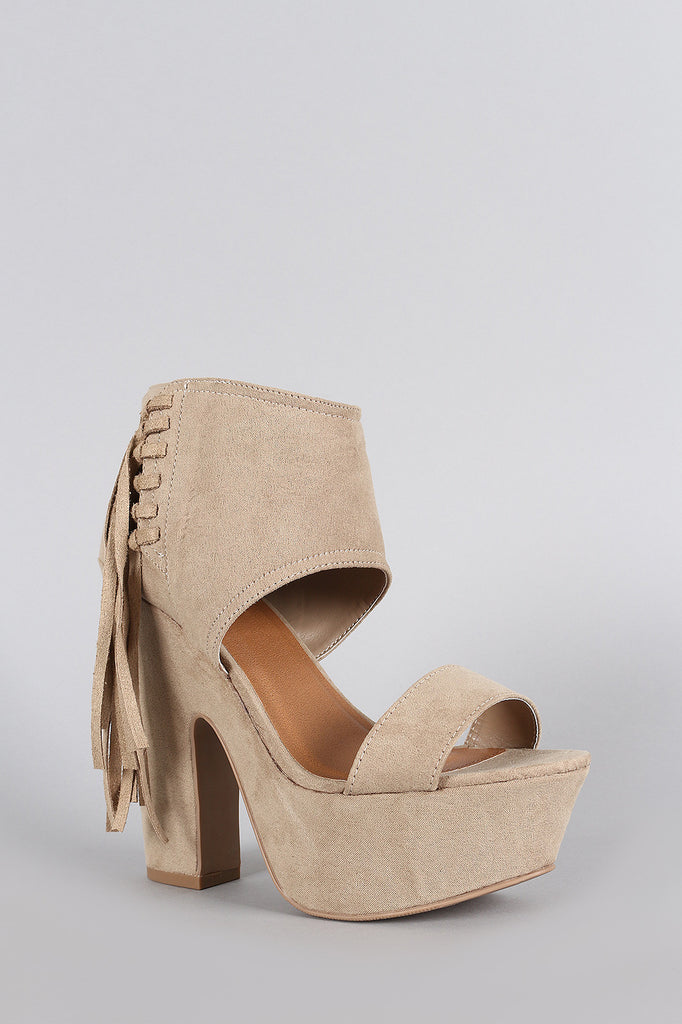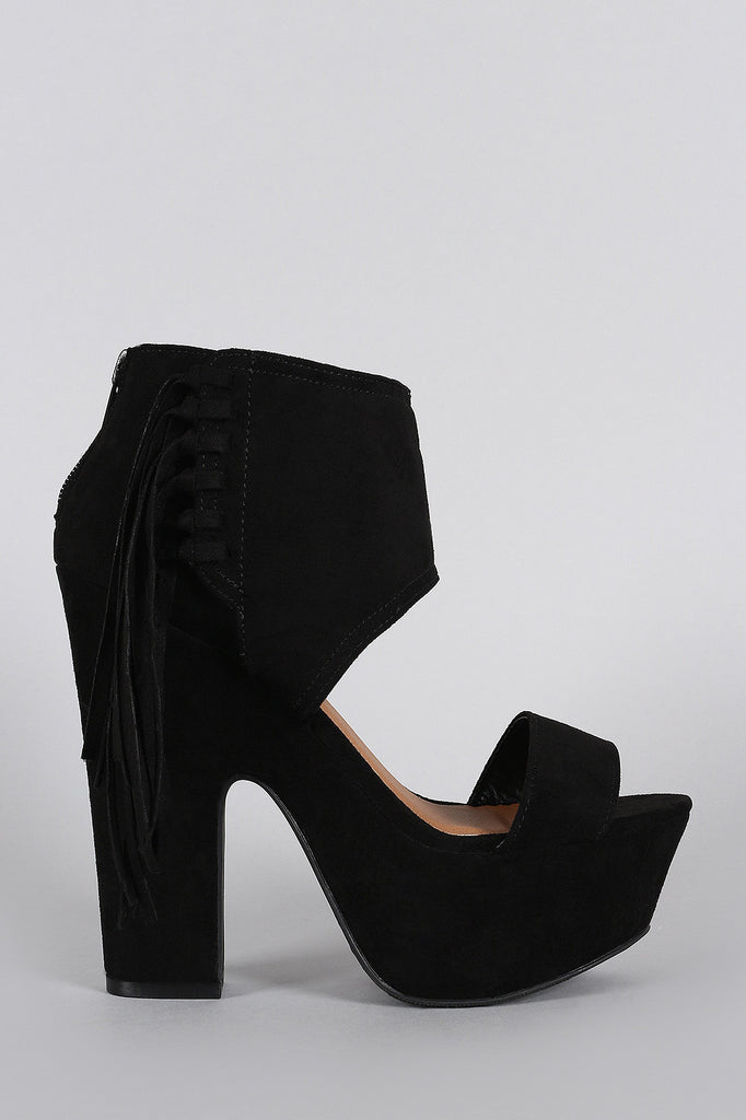 Description This platform heel features a peep toe, wide ankle cuff with side fringe design, and wrapped chunky platform heel. Finished with top stitching accents, lightly padded insole, and rear zipper closure for easy on/off.