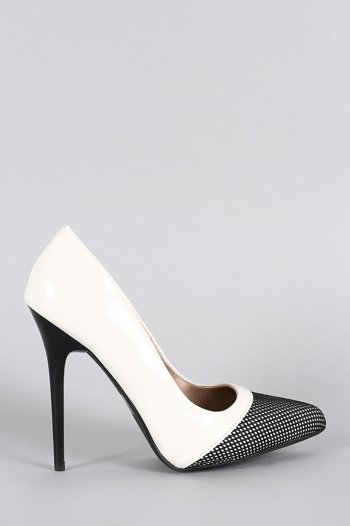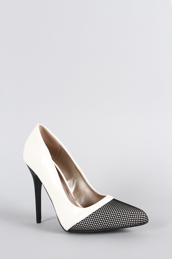 Description This pointy toe silhouette with a contrasting mesh overlay. Finished with a contrasting leg-lengthening lustrous stiletto heel.