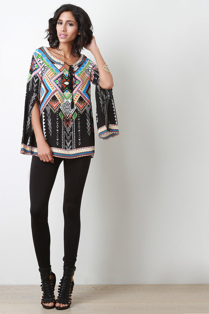 This loose-fit top features a multicolor tribal long bell sleeves that split from the inner elbow. Unlined. Accessories sold separately. 100% Rayon.
