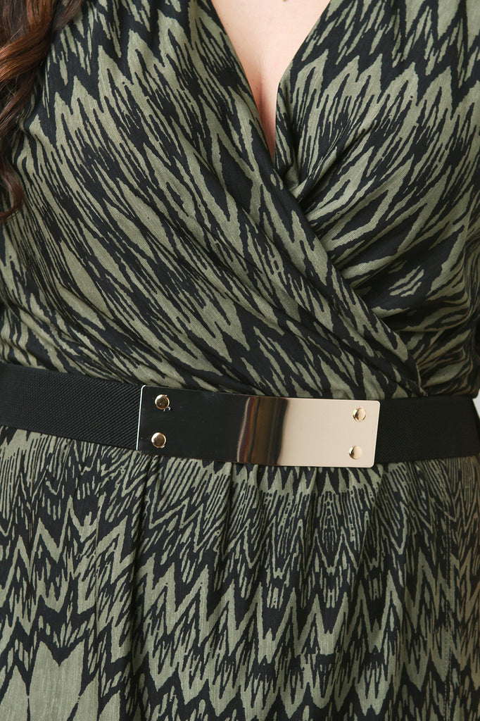 Description This flattering dress features an overlapping surplice neckline, short sleeves, cinched waist seam, skirt tier d�cor, graphic pattern design throughout, side belt loops, and highlighted with an elasticized belt accent with a metallic plate front. Accessories sold separately. Made in U.S.A.95% Polyester, 5% Spandex.