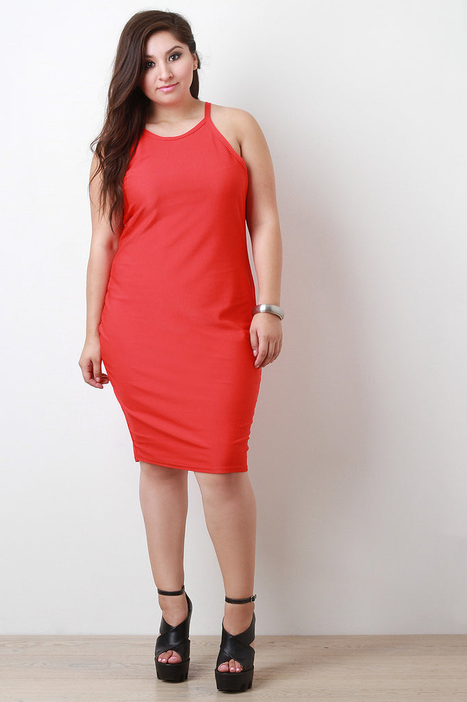 Description This dress features a rounded neckline, spaghetti shoulder straps, teardrop cutout design back, stretchy sculpture silhouette, and ribbed knit fabrication. Accessories sold separately. Made in U.S.A. 80% Nylon, 20% Spandex.