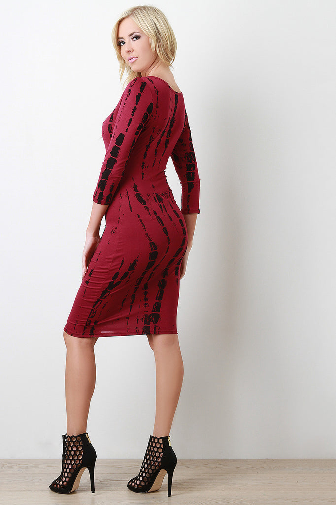 Description This midi dress features soft jersey knit, streak dye print, scoop neckline, and finished with long sleeves. Accessories sold separately. Made in U.S.A. 95% Rayon, 5% Spandex.