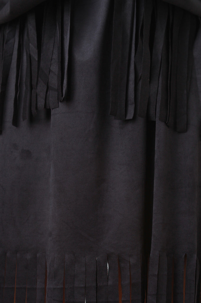 Description This vegan suede dress features an elasticized neckline for off the shoulder option, long bell sleeve with cascading fringe , shift cut design and complete with fringe hemline. Accessories sold separately. Made in U.S.A. 92% Polyester, 8% Spandex.