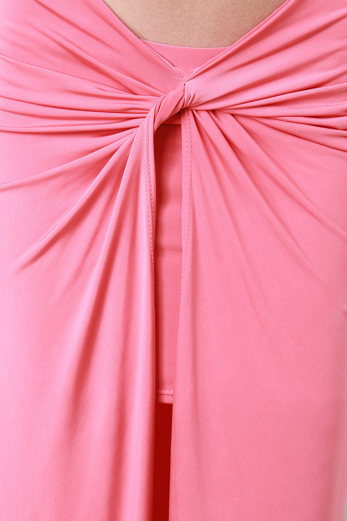 Description This sexy maxi dress features smooth stretch fabric, criss-crossing halter neck, open midriff with two straps, open back, knotted slit front maxi skirt, and finished with inner mini skirt. Accessories sold separately. Made in U.S.A. 95% Polyester, 5% Spandex.