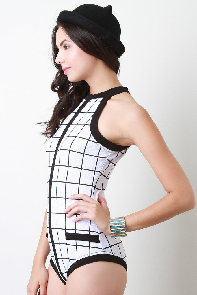 Description This sleeveless bodysuit features a cutaway construction, high round neckline, zipper fastener at back, brief bottom, grid pattern print on texture fabrication, and bold trimming. Accessories sold separately. 95% Polyester, 5% Spandex.
