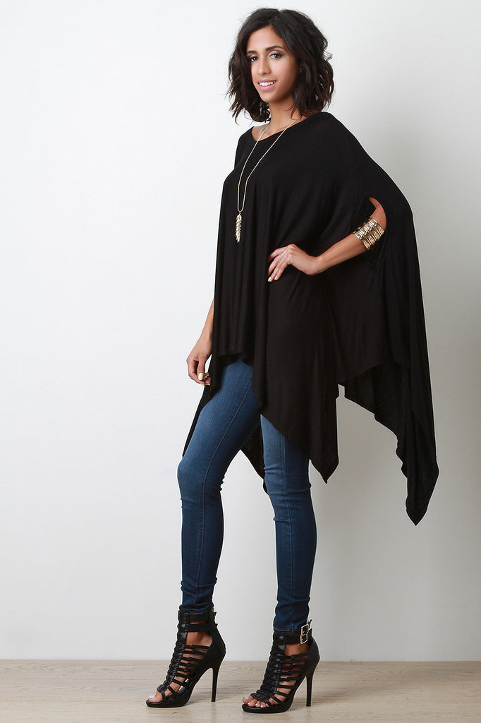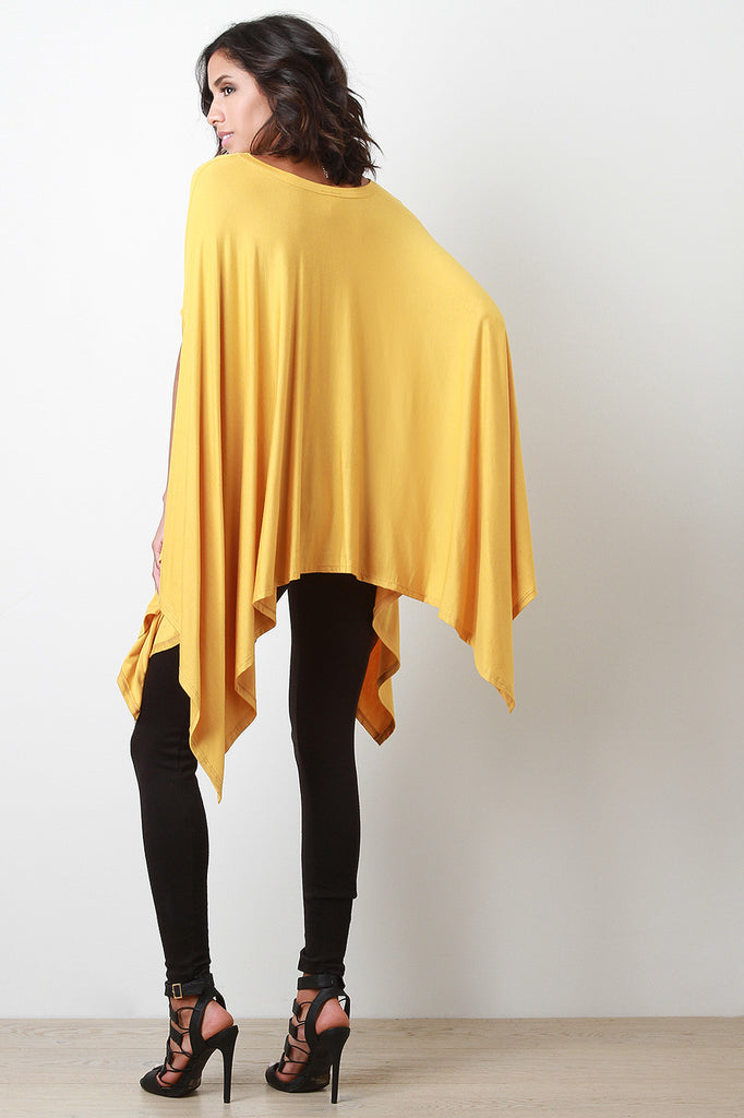 Description This jersey knit poncho top features a trapeze drape cut, round neckline, armhole opening, and asymmetrical hemline. Accessories sold separately. Made in U.S.A. 97% Rayon, 3% Spandex.