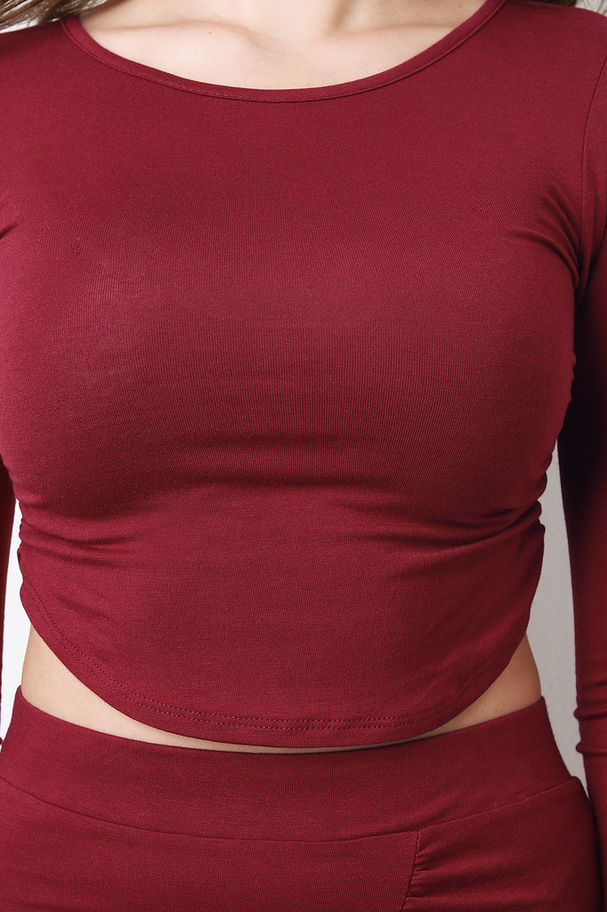 This jersey knit top features a round neckline, long sleeves, elasticized ruched sides, and round crop hemline. Accessories sold separately. Made in U.S.A. 95% Polyester, 5% Spandex.