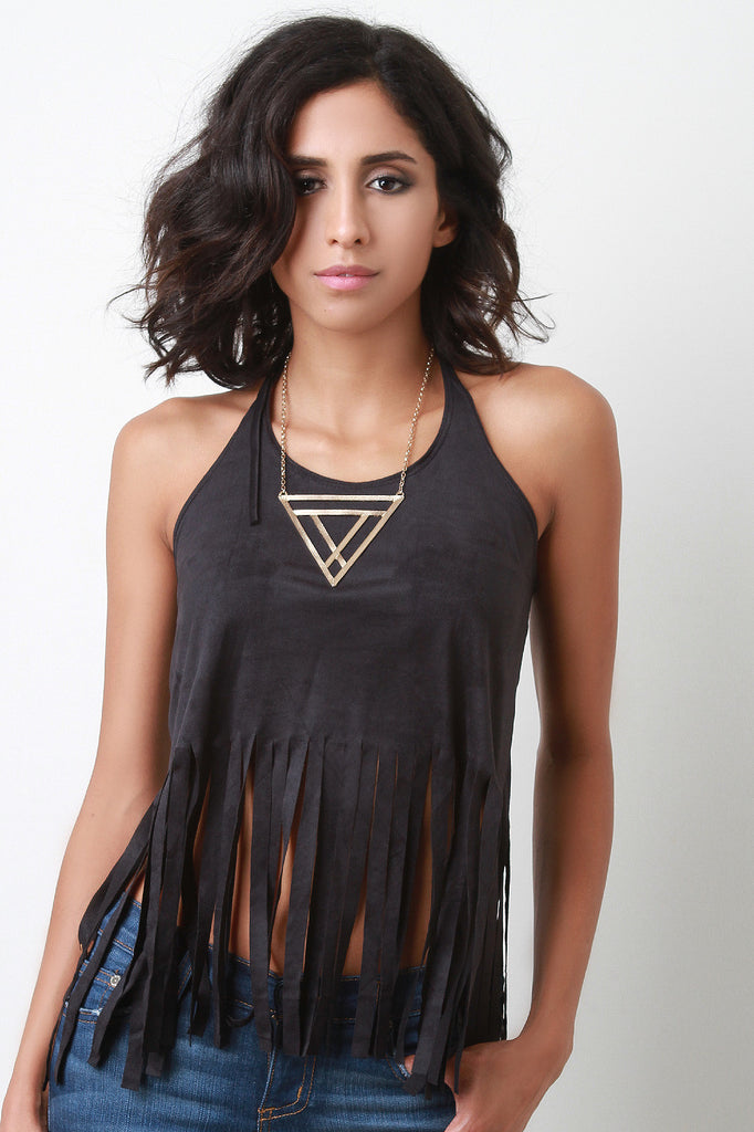 Description This sleeveless top features a round neckline, self-tie halter back closure, and long fringe hemline. Accessories sold separately. Made in U.S.A. 92% Polyester, 8% Spandex.