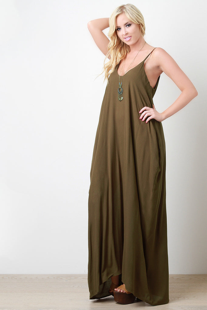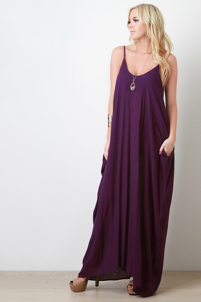This sleeveless maxi dress features a scooped round neckline and backline, thin adjustable shoulder straps, and crepe-texture fabric. Finished with side pockets. Unlined. Accessories sold separately. Made in U.S.A. 100% Rayon.