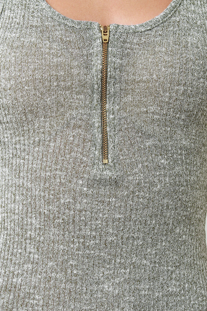 Description This sleek bodycon dress features a round neckline, with a half zip up front, sleeveless design, stretchy fit, marled ribbed knit fabrication, and midi length hemline. Accessories sold separately. Made in U.S.A. 68% Polyester, 23% Rayon, 3% Spandex.