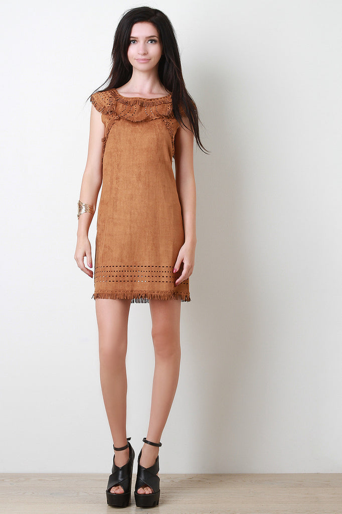 Description This microfiber vegan suede dress features a round neckline, cap sleeve design, and finished with fringe and eyelet cutout at yoke and hemline. Accessories sold separately. 95% Polyester, 5% Spandex.