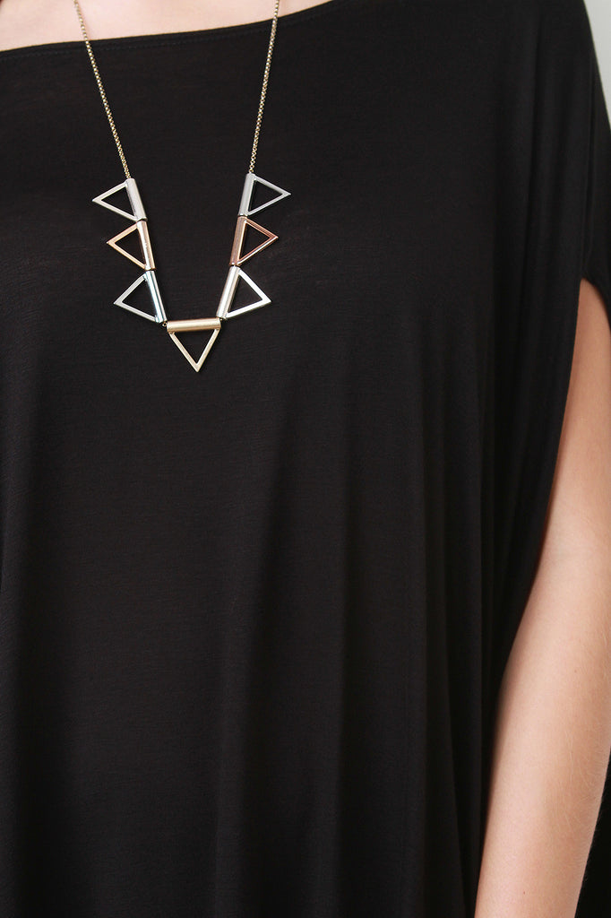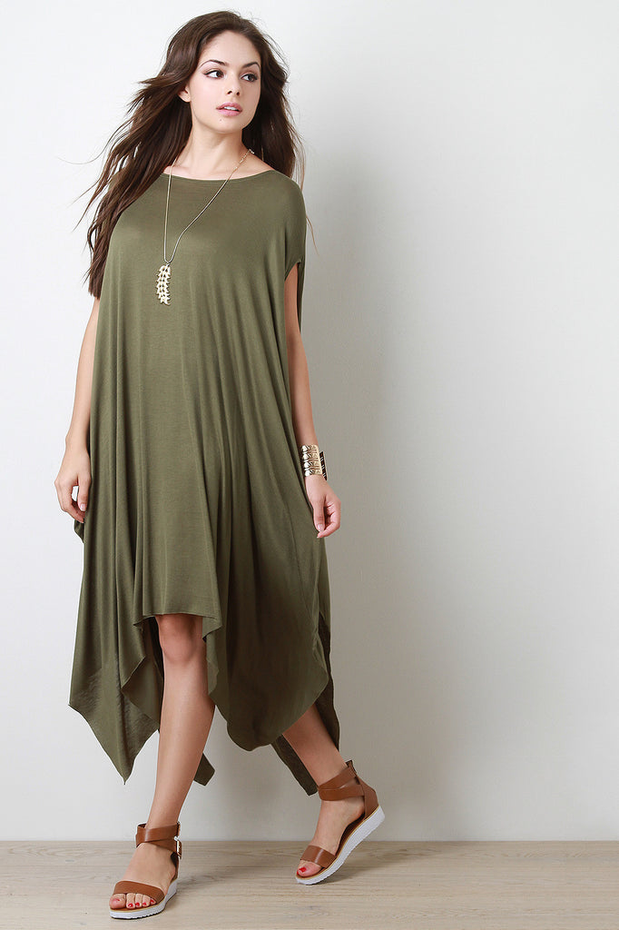 An oversize dress featuring solid color jersey, boat neckline, dropped shoulders with arm holes, and handkerchief hemline. Unlined. Accessories sold separately. Made in U.S.A. 95% Rayon, 5% Spandex.