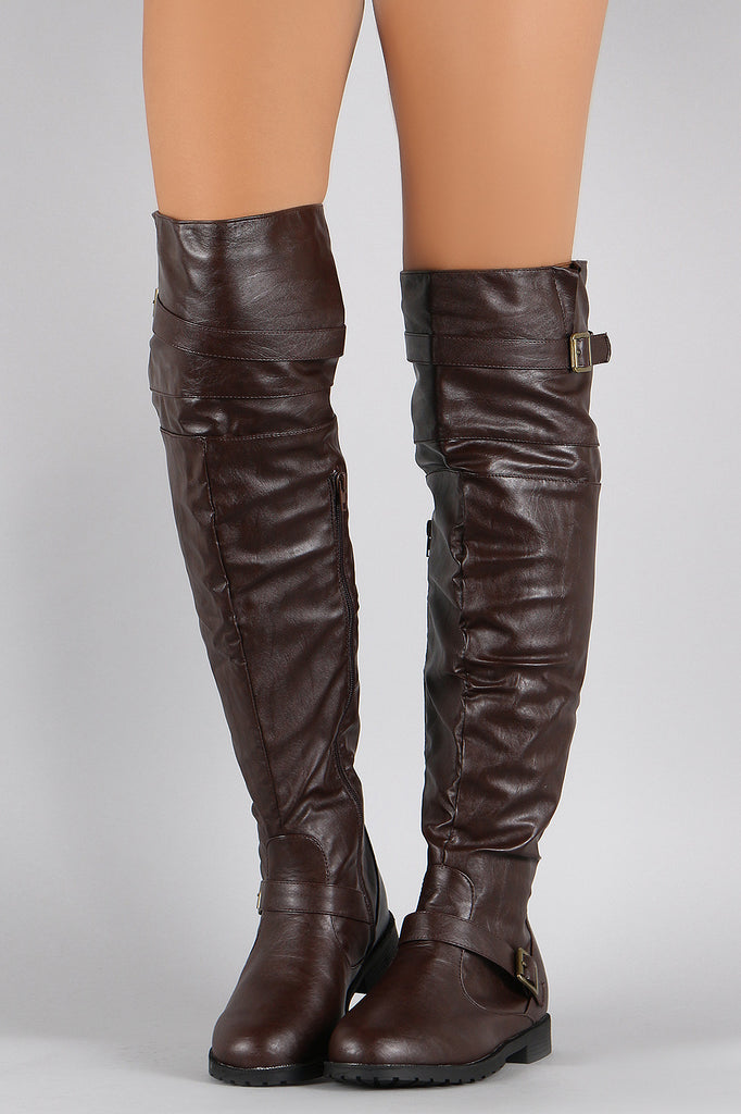 Description These fashionable over-the-knee boots feature a round toe silhouette, double buckle strap details, top stitching accents, and low block heel. Finished with cushioned insole, soft interior lining, and partial side zipper closure for easy on/off.