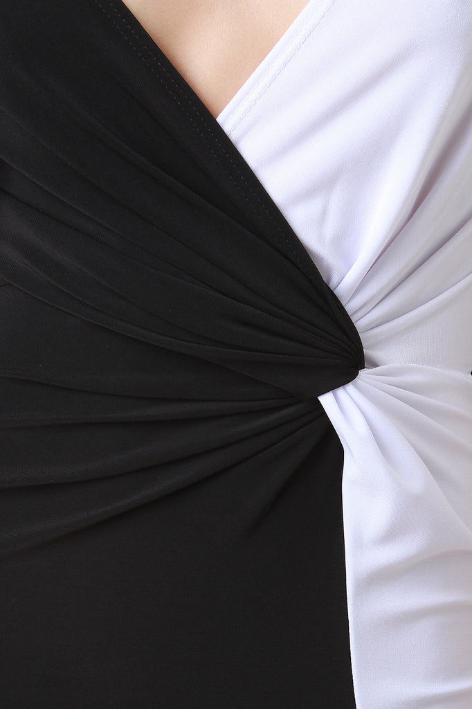 Description A two-tone maxi dress featuring smooth fabric, thin shoulder straps that cross at the back, plunging v-neckline, knotted front design, and maxi-length skirt with off-center thigh slit. Accessories sold separately. Made in U.S.A. 95% Polyester, 5% Spandex.