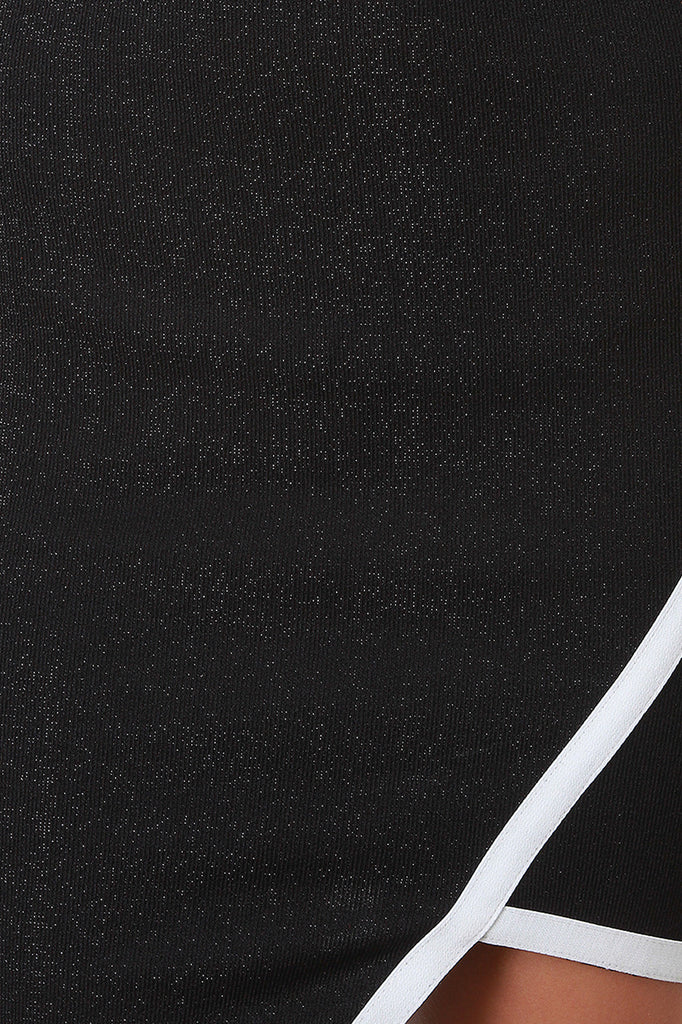 This bodycon dress features ribbed knit with shimmer accent, contrast color trim, round neckline, spaghetti straps, back keyhole cutout with single button closure at nape, and asymmetrical hemline. Accessories sold separately. Made in U.S.A. 84% Polyester, 13% Metallic, 3% Spandex.