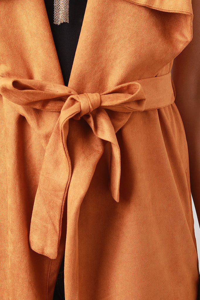 Description This longline vest features a notched collar design, open front construction, two front pocket, and tier back with slit detail. Finished with self-tie belted waist. Accessories sold separately. 95% Polyester, 5% Spandex.