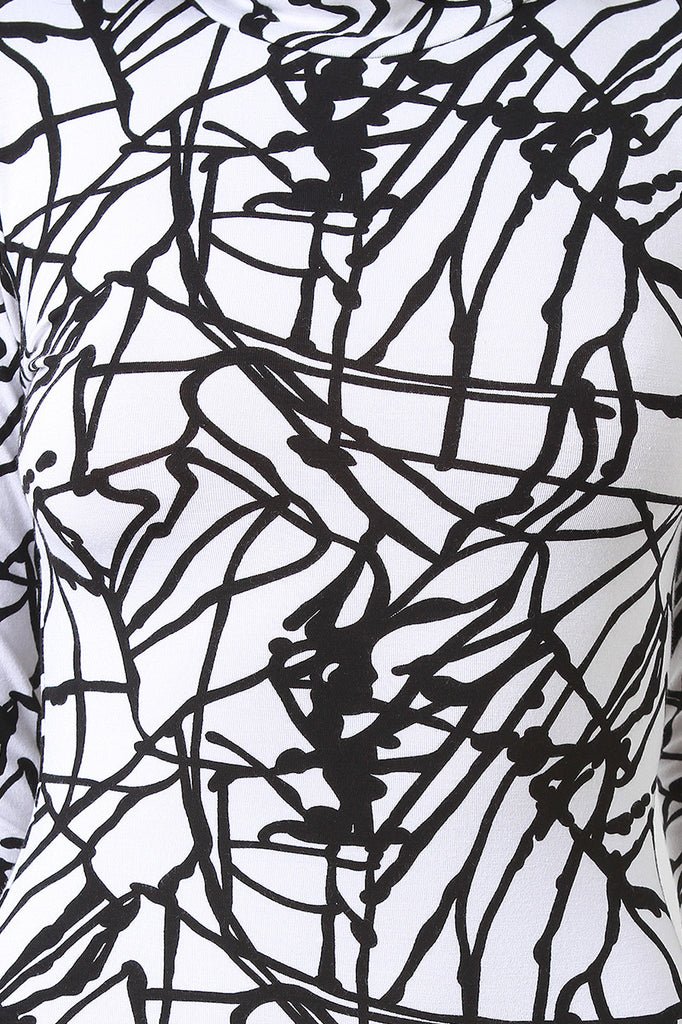 Description A mock neck dress featuring a bold scribble pattern throughout, three-quarter sleeves, and a bodycon fit with a side slit. Unlined. Accessories sold separately. Made in U.S.A. 95% Rayon, 5% Spandex.