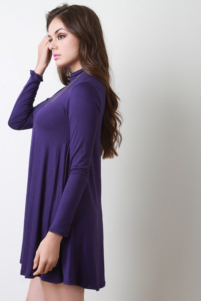 Description This jersey knit dress features a mock neckline, long sleeves, shift cut design, and mini hemline. Accessories sold separately. Made in U.S.A. 96% Rayon, 4% Spandex.