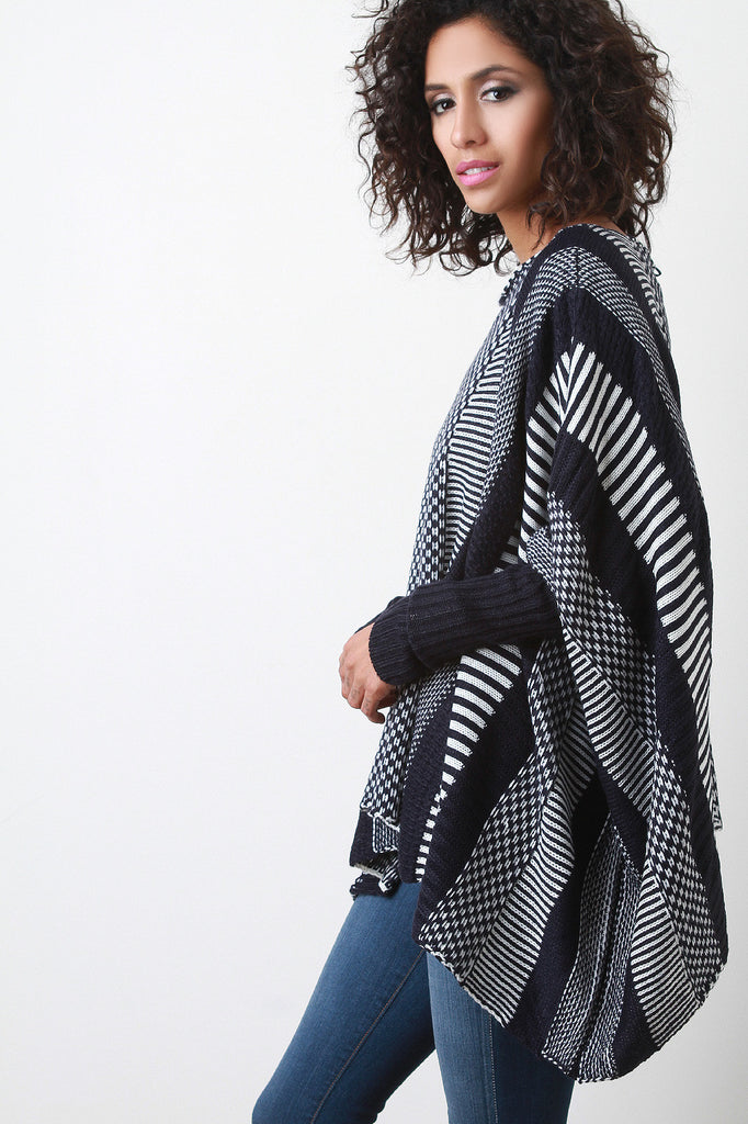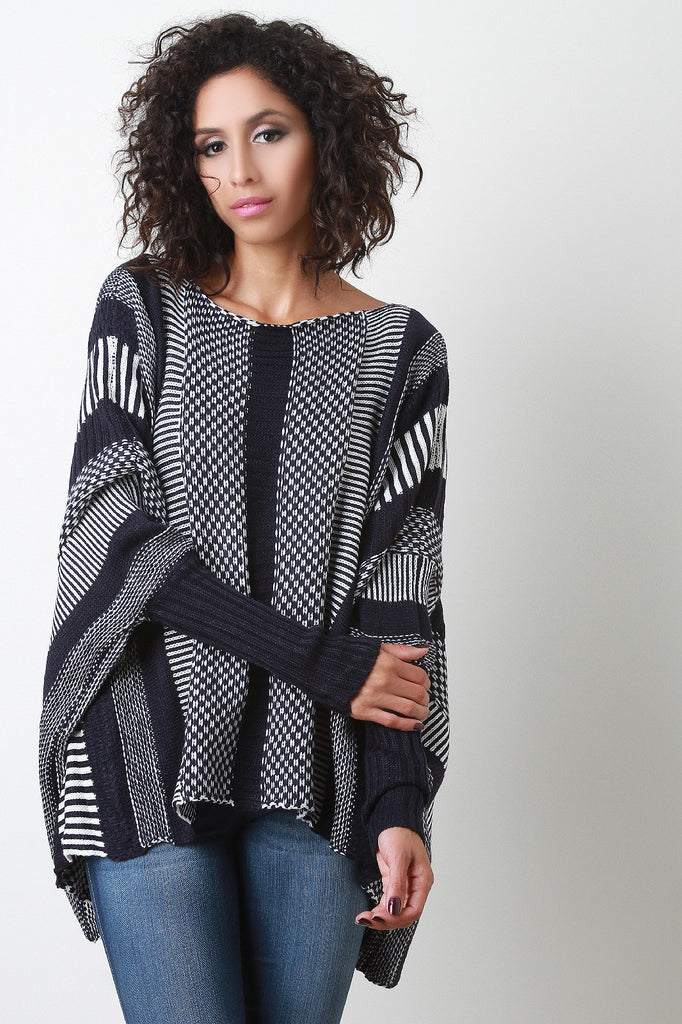 Description An oversize round neck sweater featuring stripes of different patterned knits, dropped shoulders, and dolman sleeves with long ribbed cuffs. Accessories sold separately. 100% Acrylic.