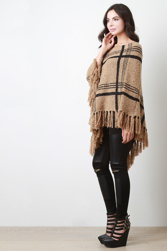 A v-neck poncho featuring a soft tufted texture knit, large grid design, and fringed hemline. Accessories sold separately. 100% Acrylic.