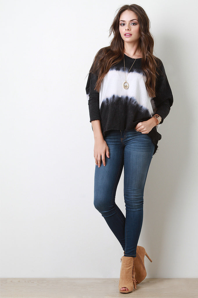 Description This casual tie dye print fabrication, v-neckline, long dolman sleeves design, and finished with raw high-low hemline. Accessories sold separately. Made in U.S.A.58% Cotton, 23% Polyester, 19% Modal.