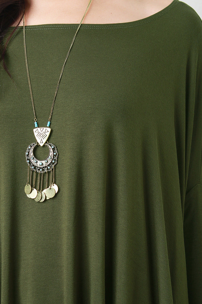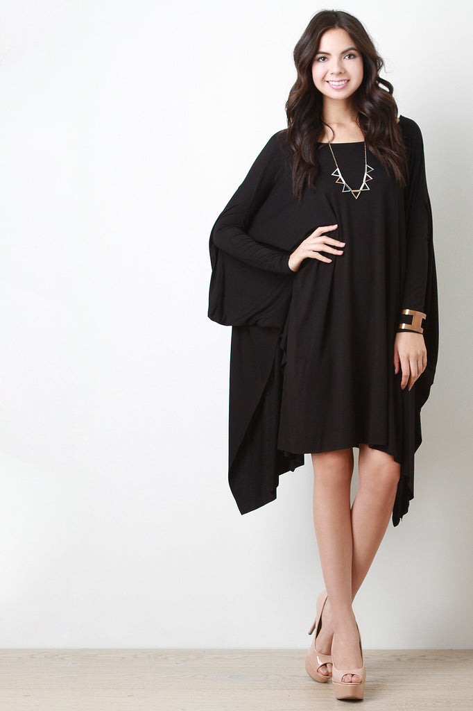 Description This jersey knit dress trapeze dress features a round neckline, long sleeves, and an asymmetrical sharkbite hemline. Accessories sold separately. Made in U.S.A. 95% Rayon, 5% Spandex.