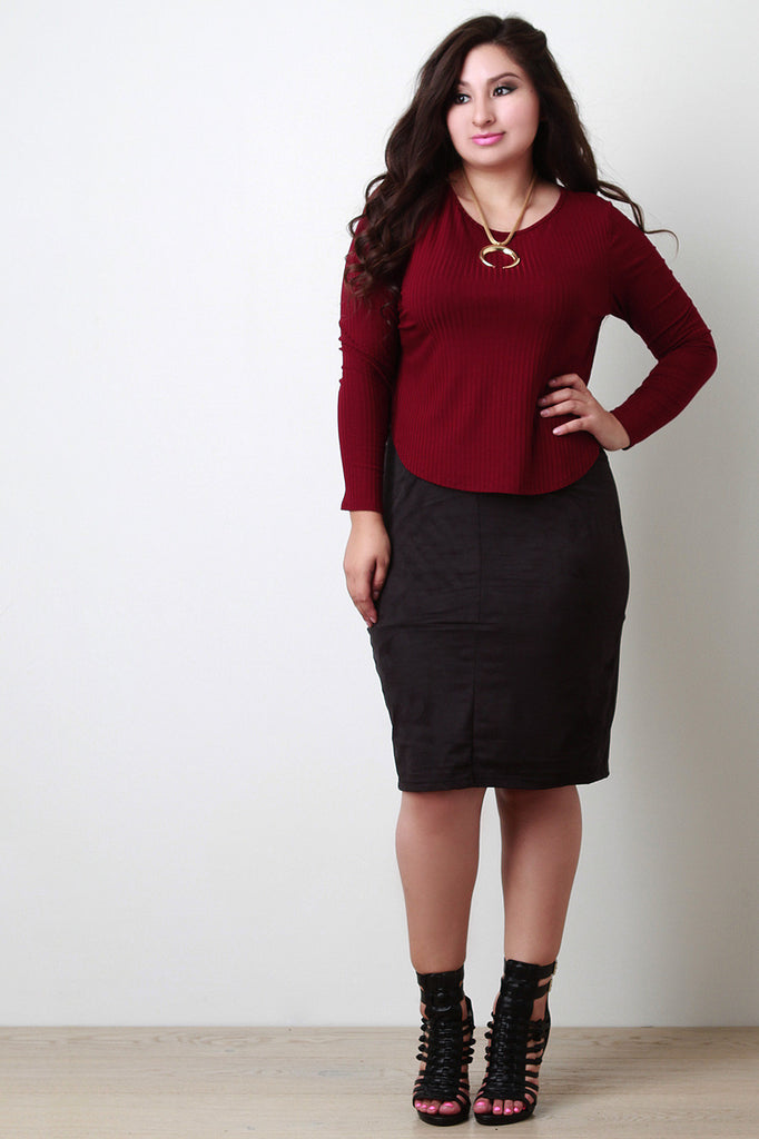 Description This plus size long sleeve top features a round neckline, ribbed jersey knit, and a curved hemline with high side slits. Accessories sold separately. Made in U.S.A. 96% Rayon, 4% Spandex.