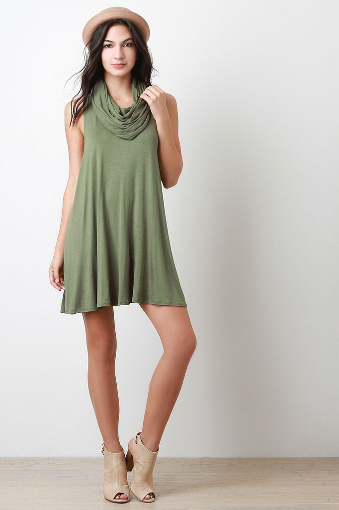 A mini sleeveless dress featuring jersey knit, cowl neck, and relaxed shift fit. Unlined. Accessories sold separately. Made in U.S.A. 96% Rayon, 4% Spandex.