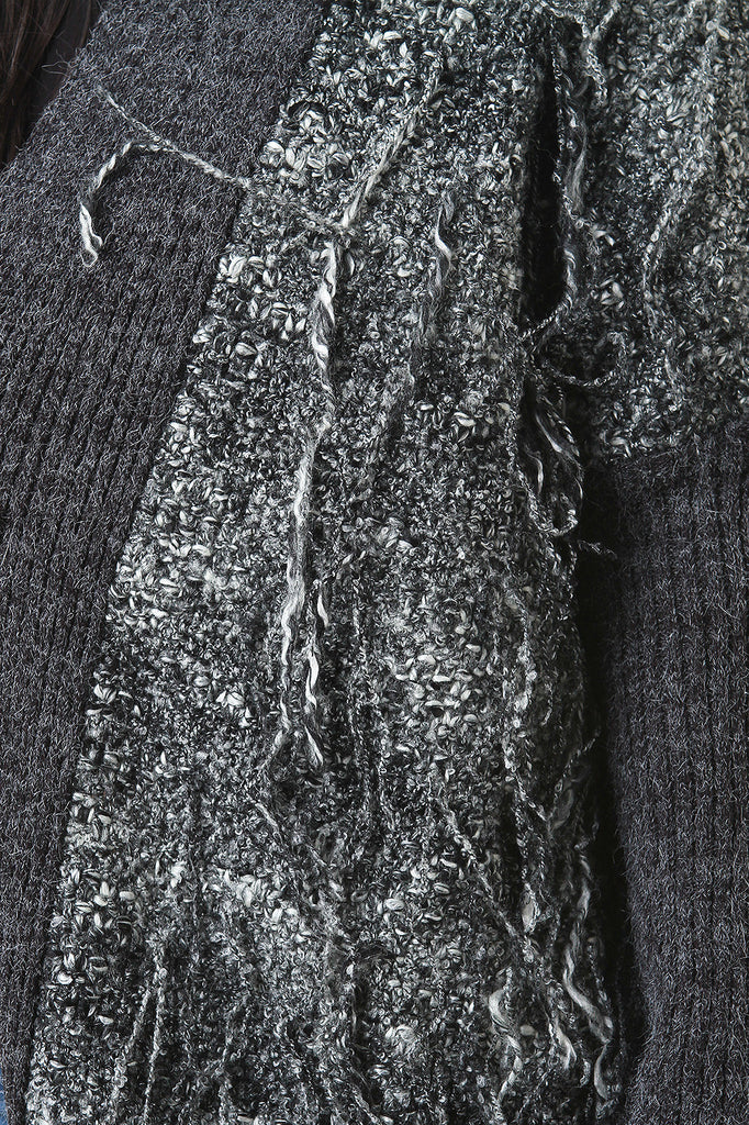 Description A long ribbed knit cardigan featuring an open front, dropped shoulders with dolman sleeves, and melange knit panels with outward-facing frayed fringe accents. Finished with side pockets. Accessories sold separately. 11% Wool, 15% Polyester, 74% Acrylic.