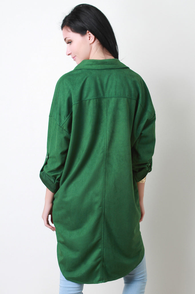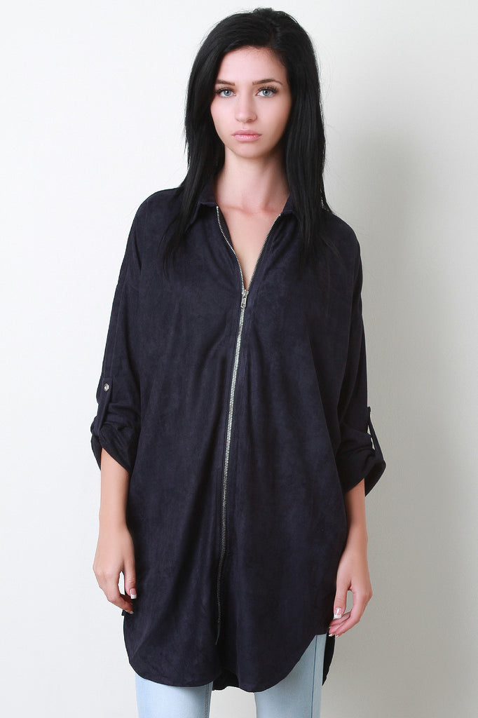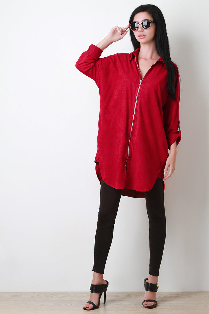 Description This oversized button-up shirt features a soft vegan suede, classic shirt collar, long sleeves with single button cuff closure, and full-length front zip up closure. Finished with side slits and rounded hemline. Accessories sold separately. Made in U.S.A. 95% Polyester, 5% Spandex.