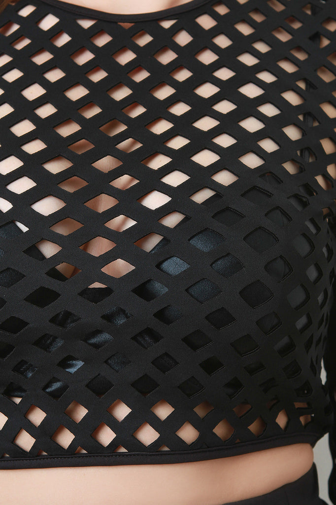 This scuba knit top features diamond laser cutout construction, round neckline, long sleeves, and crop hemline. Underlay not included. Accessories sold separately. 95% Polyester, 5% Spandex.